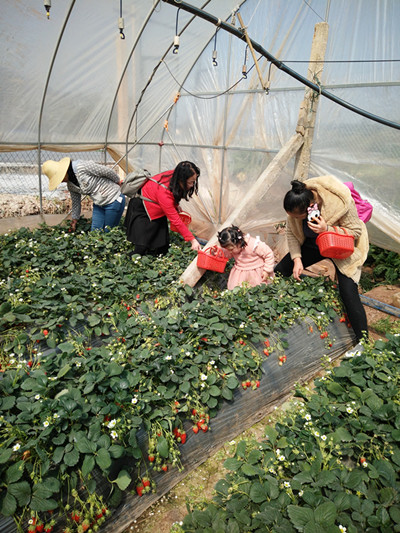 一大早,公司專門為我們準(zhǔn)備了一個(gè)男同事作為我們的專屬司機(jī),在公司領(lǐng)導(dǎo)和男同事們的祝福中,大家都帶著喜悅的心情、幸福的笑容,踏上了旅程,一路歡聲笑語。對了,此次旅行還有小白姐家的小公主,她話不多,但是很可愛。因?yàn)橹皇且惶斓穆贸?,所以我們就選擇了距離昆明不遠(yuǎn)的安寧市走走逛逛,其實(shí)重點(diǎn)是為了安寧的草莓園而去的,順便看看春天里迷人的景色。昆明到安寧的路程不遠(yuǎn),一個(gè)小時(shí)左右就到了,一下車我們就直奔了同事介紹的草莓園,每個(gè)人提著一個(gè)小籮筐進(jìn)了草莓園,對于我來說這樣自己到園子里摘草莓是第一次,覺得很新鮮,感覺很好,一進(jìn)園子看到大大小小紅燦燦的草莓大家都好激動,小公主顯得更開心,進(jìn)了草莓園開始在跟她媽媽說悄悄話,也能自己提著籃子摘草莓呢,看看她們母女自然的挨著,竟是這樣一副美麗的畫面。
