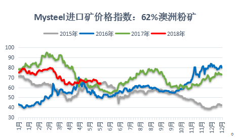 5月鐵礦石價(jià)格前高后低,整體震蕩運(yùn)行小幅下跌,5月均價(jià)65.65美元/噸,環(huán)比4月均價(jià)65.03美元/噸小幅增加0.62美元/噸。Mysteel62%澳粉指數(shù)報(bào)收于64.30美元/噸,環(huán)比4月底下跌1美元/噸。月初鐵礦石價(jià)格延續(xù)4月底偏強(qiáng)態(tài)勢(shì)運(yùn)行,直至中旬復(fù)產(chǎn)邏輯體現(xiàn)較為明顯,月中達(dá)到68.05美元/噸的當(dāng)月高點(diǎn)。隨后環(huán)保政策力度加強(qiáng),繼續(xù)壓制礦石需求的預(yù)期出現(xiàn),港口庫(kù)存總量月中開(kāi)始反彈增量,礦石價(jià)格轉(zhuǎn)向疲軟走勢(shì),價(jià)格震蕩下行至64.3美元/噸。