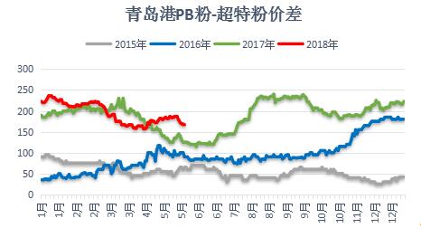 高低品價(jià)差5月整體走高,維持在175元附近,中上旬隨著價(jià)格整體的上揚(yáng),PB粉與超特粉價(jià)差也有所擴(kuò)大,鋼企成材高利潤(rùn)與低庫(kù)存使得高品需求依然偏強(qiáng),高低品價(jià)差擴(kuò)大。中旬開(kāi)始因價(jià)格快速回落,低品粉礦價(jià)格低位支撐較強(qiáng),高低品價(jià)差快速收窄。
