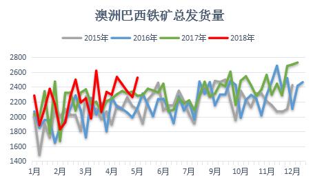 5月澳洲與巴西鐵礦石發(fā)運(yùn)總量預(yù)計(jì)9565.7萬(wàn)噸,環(huán)比上月同期增加343.7萬(wàn)噸,同比去年增289.9萬(wàn)噸。澳洲與巴西主流礦山發(fā)貨在5月份均有一定程度的上升,但同比增速來(lái)看整體有所放緩。從發(fā)運(yùn)目的來(lái)看,澳洲發(fā)往中國(guó)量增幅有明顯增加,力拓和FMG的運(yùn)量漲勢(shì)較為明顯。分品種來(lái)看5月塊礦發(fā)運(yùn)呈現(xiàn)持續(xù)下降走勢(shì),目前發(fā)運(yùn)水平基本與前兩年持平。